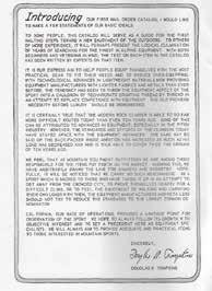 Una lettera da parte di Doug Tompkins nel primo catalogo di The North Face, pubblicato nel 1968. Si evince chiaramente l’intento del co-fondatore, cioè fornire agli esploratori un equipaggiamento che rispecchi il proverbio “prima il necessario, dopo il lusso”