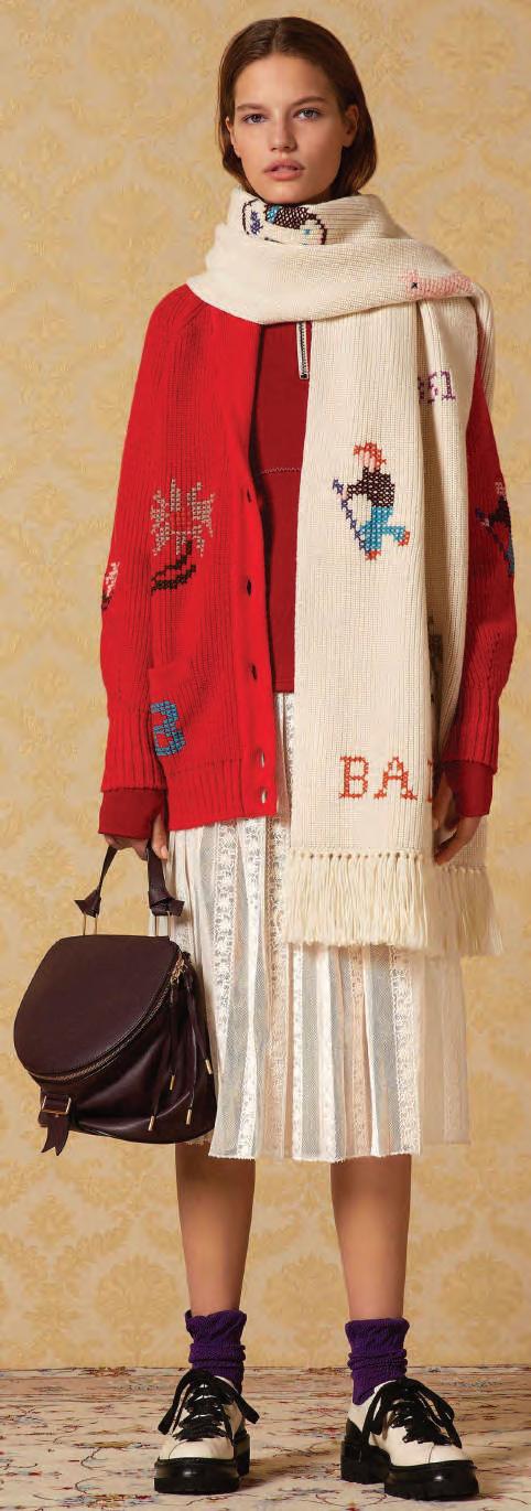 Per la collezione autunno-inverno 2019, l’ispirazione di Bally arriva dalla Svizzera e dalla pionieristica storia del brand che lo lega alla montagna. Il colore gioca un ruolo fondamentale ed è ispirato dal lavoro fotografico del ritrattista norvegese Jarle Hagen. Gli outfit richiamano ricordi di weekend tra cime innevate con gli amici e lo stile sportivo degli Anni ’90. Rimandi nostalgici sono ricamati a punto croce su voluminosi maglioni e stole. Cappotti in shearling con motivo a zigzag avvolgono tute ricamate. Gonne in pizzo con motivo edelweiss sono indossate sotto cappotti e maglioni, mentre cappe in pelle sono addolcite da polsini in montone.