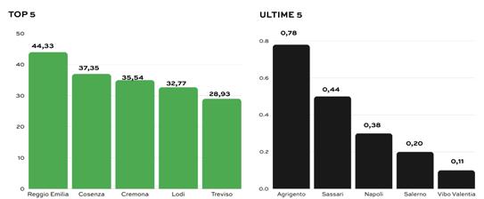 MOBILITÀ ALTERNATIVA ALL’AUTO: QUOTA AL 38,9% Nel 2024 la mobilità urbana alternativa all’auto ha raggiunto il 38,9% degli spostamenti complessivi: il miglior risultato dal periodo pre-pandemico. Un dato che conferma un cambiamento graduale ma consolidato nelle abitudini di spostamento. Sul piano infrastrutturale, la disponibilità media di percorsi ciclabili nei capoluoghi si attesta a 10,39 metri equivalenti ogni 100 abitanti. L’indicatore comprende piste in sede propria, corsie riservate, percorsi promiscui bici/pedoni e zone a 20 e 30 km/h. Il dato segna una lieve flessione rispetto al 2023, ma mostra un incremento del +44,9% rispetto al 2015. Una crescita significativa nel medio periodo, che però non elimina le differenze territoriali: Reggio Emilia, Cosenza e Cremona guidano la classifica per dotazione ciclabile, mentre in diverse città del Mezzogiorno i livelli restano inferiori alla media nazionale. Sul fronte dell’intermodalità emergono segnali incoraggianti: