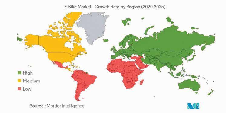 La società di consulenza indiana Mordor Intelligence ha da poco redatto la relazione “eBike Market - Growth, Trends, and Forecasts (2020 - 2025)”, secondo cui il mercato delle eBike è stato valutato a 15,42 miliardi di dollari nel 2019 e si prevede che vedrà un crescita del 7,49% durante il periodo 2020-2025. Oltre alla crescente preferenza dei consumatori verso attività ricreative e avventurose, si prevede un aumento dell’utilizzo delle eBike in diversi settori, come la logistica e i servizi di noleggio, trend che guideranno il mercato. Il maggior consumo di bici elettriche è stato registrato in Cina. A causa dell'epidemia di Covid-19, dei blocchi e delle restrizioni che ne sono seguite, la produzione di eBike ha subito un declino, ma ora il mercato sta nuovamente accelerando a causa della crescente do-