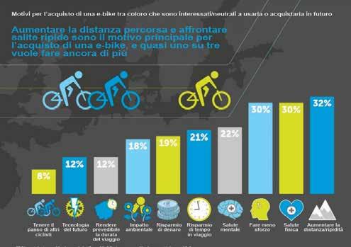 L’Europa rappresenta circa il 20% del mercato delle eBike dopo la regione Asia-Pacifico, con la Germania in testa per quanto riguarda gli acquisti seguita da Francia e Italia. Secondo il sondaggio di Shimano, i ciclisti più propensi all’acquisto di una eBike nel 2020 sono coloro che escono sulle due ruote una o due volte a settimana, per un aumento in percentuale pari al 20%. Tra le ragioni principali che motivano la voglia di provare l’esperienza della pedalata assistita c’è la voglia di conquistare distanze più lunghe o salite più ripide (32%); il desiderio di migliorare la propria salute fisica (e mentale 22%) insieme al vantaggio di fare meno fatica, che vanno a braccetto e si assestano entrambi al 30%, mentre per il 18% è una questione di impatto ambientale. In alcuni Paesi come Danimarca, Svizzera e Regno Unito ci sono segnali promettenti tra le nuove generazioni, poiché i giovani di età compresa tra i 18 e i 24 anni hanno affermato di essere più propensi a usarne una rispetto a qualsiasi altro gruppo di età. L’altra faccia della medaglia, però, vede il business dell’elettrico ancora troppo caro e vi riconosce uno dei deterrenti in fase di decisione di acquisto (40%). È anche vero che, per un italiano su quattro l’eBike, a lungo tendere, permette loro di risparmiare e ridurre i tempi di percorrenza per raggiungere il proprio luogo di lavoro.