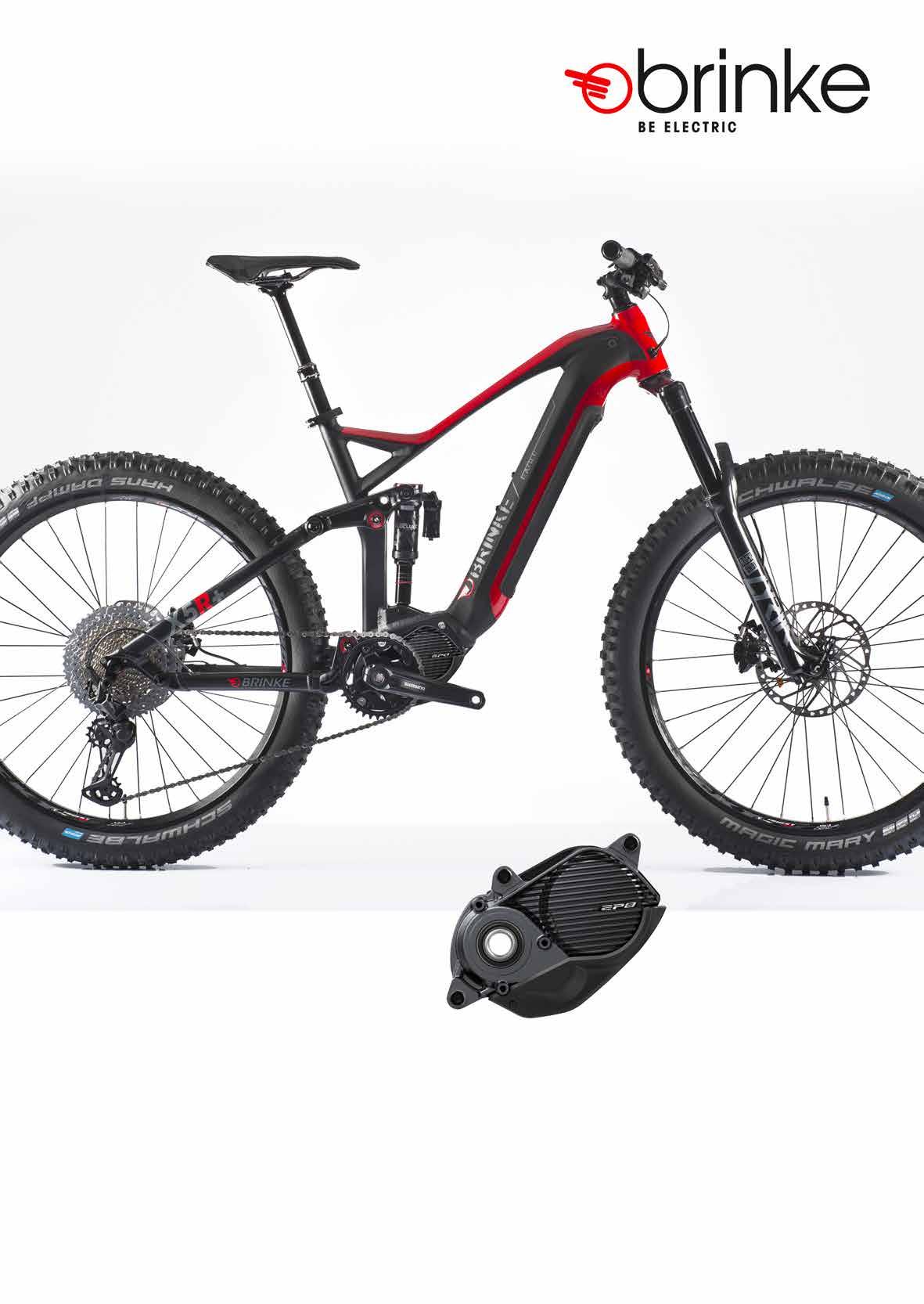Il telaio della X5R+ è in alluminio idroformato 6061, quindi robusto e leggero, con un chain stay di 44 mm ed escursione della forcella di 160 mm. Per l’anteriore Brinke ha scelto la Rock Shox 35 Gold RL, che assicura stabilità e assorbimento, e sostiene il rider anche nelle condizioni più impegnative, per una guida sempre fluida sul lento e sul veloce. Al posteriore invece, l’ammortizzatore scelto è il Rock Shox RS Deluxe Select. Una bici di questo tipo non ha solo bisogno di spinta e velocità, deve potersi fermare e rallentare come richiesto dal pilota, quindi Brinke dota la X5R+ dei collaudati e potenti freni Shimano MT501 idraulici con rotori da 203 mm e degli pneumatici Schwalbe Magic Mary da 27,5” con abbondante sezione da 2.8”. Questa combo garantisce grande grip e controllo in fase di rallentamento, e coadiuva il motore EP8 in fase di trazione. La trasmissione è Shimano XT con tecnologia HyperGlide+, per cambiate fulminee e una pedalata sempre fluida. Infatti, riduce i tempi per saltare da una corona all’altra di un terzo. Completa la dotazione l’immancabile reggisella telescopico, che permette di affrontare le salite più pendenti e le discese più tecniche grazie alla modifica dell’altezza di sella e quindi la modifica della posizione di guida del rider. brinkebikes.com