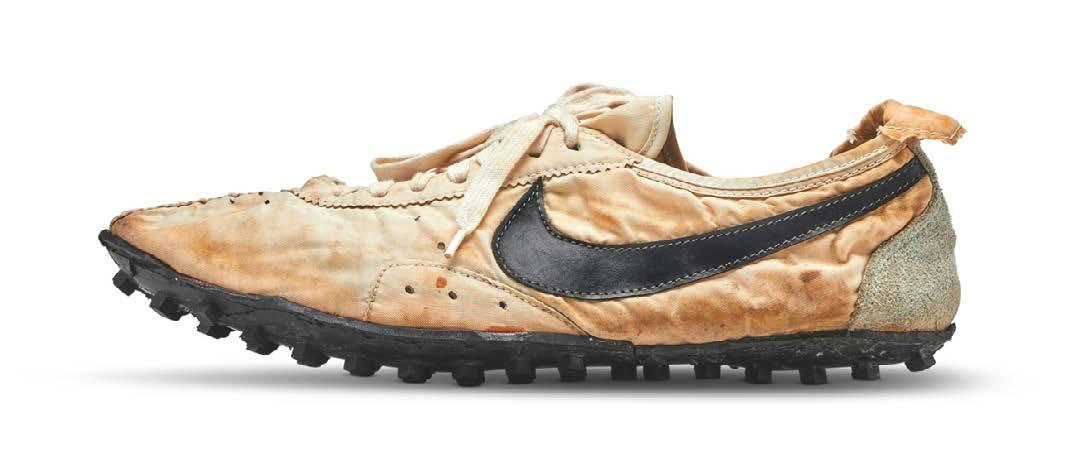 Durante lo scorso mese di luglio la nota casa d’aste Sotheby’s, in collaborazione con Stadium Goods, ha battuto all’asta nella sua sede newyorkese un lotto rinominato “Ultimate Sneaker Collection”, composto da cento delle più rare, desiderate e costose sneaker mai prodotte. Novantanove dei cento modelli a catalogo (tra questi entrambe le versioni della Nike Air Mag, le NMD HU prodotte da adidas per Pharrell Williams e Chanel oltre a diversi sample mai andati in produzione della collezione collaborativa di Air Jordan e Travis Scott) sono stati acquistati prima dell’asta dall’investitore canadese Miles Nadal, che si è aggiudicato il lotto con un’offerta di 850.000 dollari. L’unica scarpa non inclusa nel lotto era una Nike Moon Racer, realizzata a mano nel 1972 dal coach della squadra di corsa dell’Università dell’Oregon e fondatore di Nike Bill Bowerman. La base d’asta è stata fissata a 80.000 dollari, con un prezzo finale stimato di circa 160.000 dollari. L’offerta vincente, sempre di Nadal, ha superato ogni previsione rendendo la Nike Moon Shoe la scarpa sportiva più costosa mai battuta all’asta, attestandone il valore a 437.500 dollari.