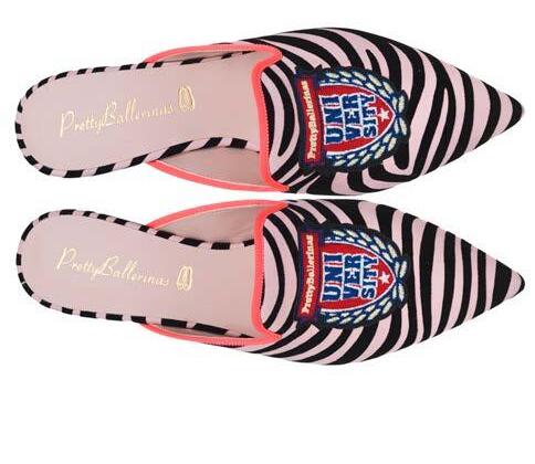 Qualità, design e innovazione, tecnologia e artigianalità, sono le parole guida dell’azienda minorchina PrettyBallerinas. Il marchio di ballerine più amato dalle celebrities di tutto il mondo, per la prossima stagione calda riporta in auge la mules. Realizzata in diverse combinazioni, il nuovo fiore all’occhiello della maison rimarca la vivacità dell’animo della griffe. Comele Mules a punta in fantasia zebrata e profili rosa fluo, logo Pretty Ballerinas University ricamato.