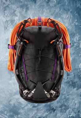 Versatility is enhanced by fully removable or adjustable accessories, depending on the intended use. The front chain allows you to attach your helmet and secure an elastic cord, useful for quickly storing a layer of clothing on the outside. The side straps help compress the bag when it is not fully loaded and can also be used in winter to carry skis in an A-Style configuration (ski straps included). Alternatively, skis can be carried diagonally using the expandable lower straps. The ice axe holders are fully removable and can also be used to carry trekking poles. The top strap is used to compress the roll-top and attach a carrying cord.