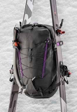 + adjustable and removable front elastic cord, ice axe holder, compression strap, and ski strap for carrying skis in an A-frame or diagonal position