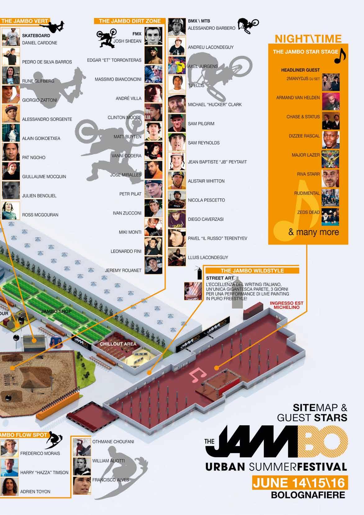 Cresce giorno dopo giorno l’attesa per The JamBO, il nuovo super evento del quale vi abbiamo ampliamente parlato in apertura dello scorso numero di Pointbreak Magazine. E che qui si presenta anche in una veste grafica prorompente, grazie alla speciale sovracopertina che avvolge il nostro magazine: all’interno del poster centrale trovate tra l’altro il rendering delle varie strutture con alcuni dei principali protagonisti che le animeranno nel corso dei 3 giorni di action sport e musica assolutamente da non perdere (14-16 giugno). L’arena di