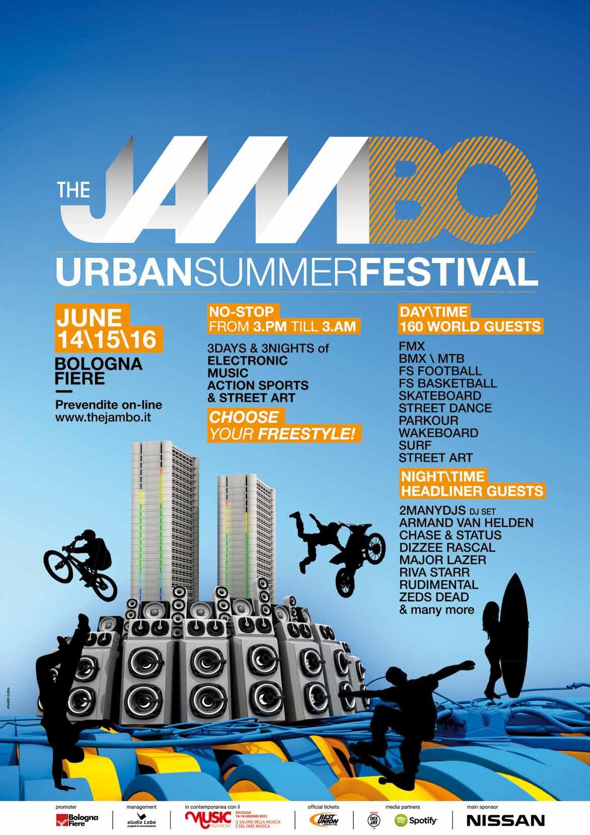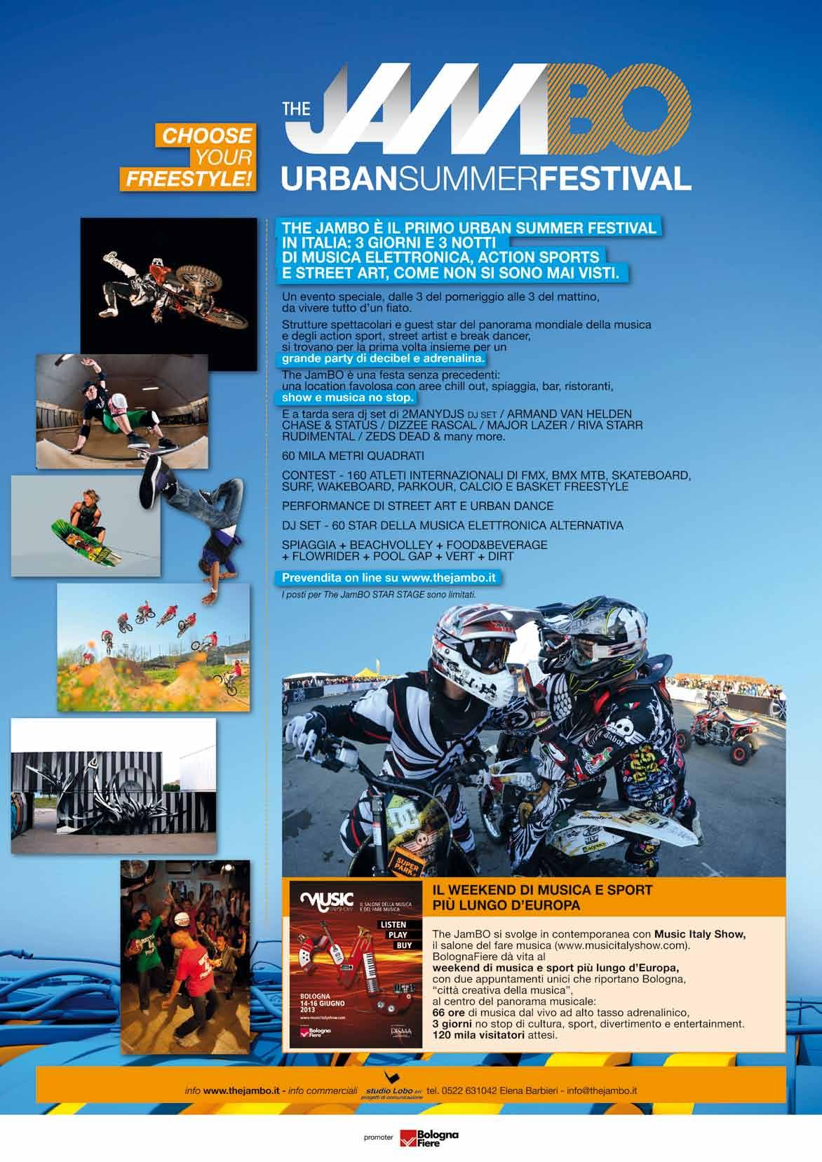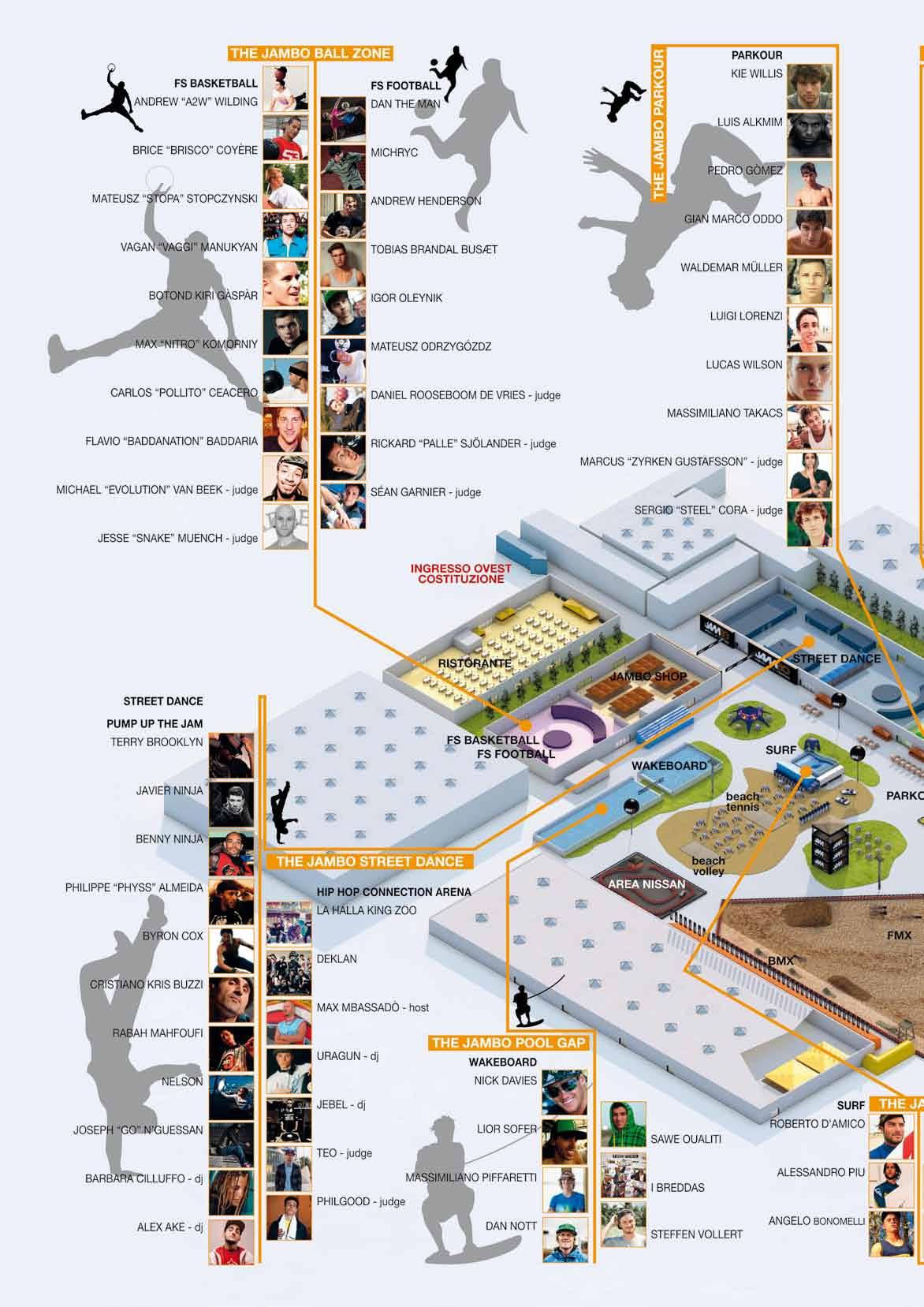 metri per patiti di STREET ART e addirittura una spiaggia con beach volley e relative tribune più aree chill out. Non certo da meno l’area dedicata alla musica con un padiglione di 12 mila metri quadrati, palco di 120 metri quadrati e videowall. Prevista anche una ricca area espositiva dedicata agli articoli sportivi, oltre alla presenza di atleti di riferimento italiani e internazionali. Per scoprire tutti protagonisti, per apprezzare il ricco programma musicale e per tutti gli altri dettagli visitate il sito ufficiale. www.thejambo.it