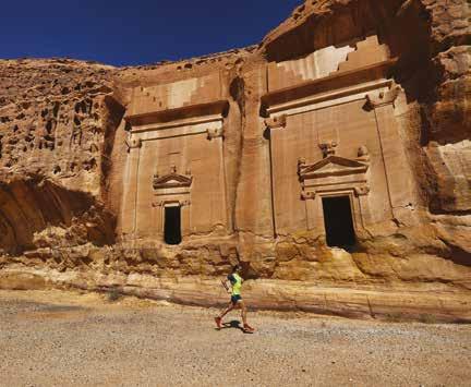 D opo aver prenotato online, operazione d’obbligo, e quindi aver fissato giorno e ora per il tour guidato al sito archeologico di Hegre, che dista 22 chilometri da Al Ula, Michele decide di raggiungerlo di corsa. Al gate d’ingresso, non ancora pago, chiede di poter seguire il nostro gruppetto, che all’interno del sito si muove su un veicolo elettrico, ancora di corsa. Accontentato nella sua “bizzarra” richiesta, Michele trotterella gli oltre 13 chilometri di piste sterrate che serpeggiando nel deserto uniscono le principali tombe del sito. Alcune vicine tra di loro, quasi fossero state scavate in serie e altre solitarie e isolate, questi 131 sepolcri mostrano nelle loro facciate levigate e ben scolpite la grande arte rupestre che fu dei Nabatei. Un’arte sublime che, grazie al clima secco della zona, si è ben conservata e ora si mostra discretamente integra agli occhi di un turismo, per fortuna non ancora di massa, che la viene ad ammirare.