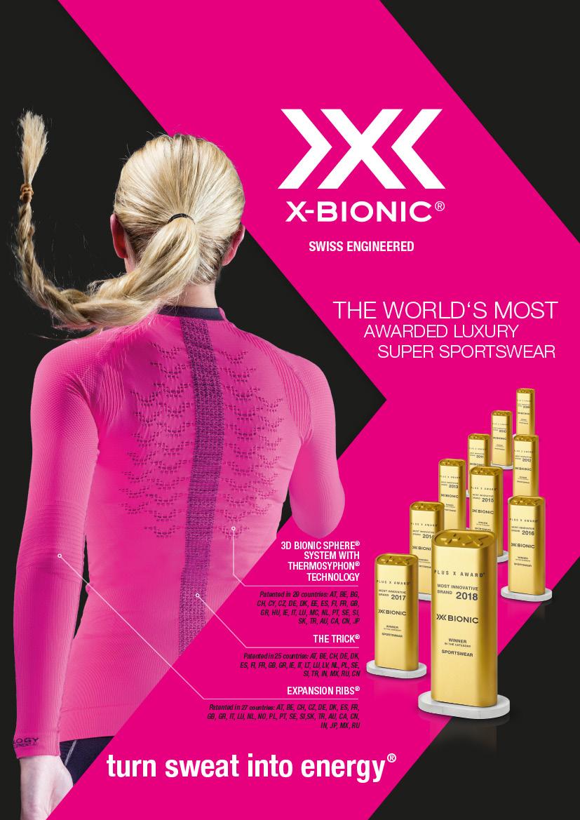Il sistema 3D Bionic Spehere con tecnologia brevettata Thermosyphon, creata grazie al sistema di lavorazione Retina, prevede una costruzione del tessuto a spirale, costituita da canali orizzontali e verticali, che agevola l’uscita del sudore: in questo modo lo sportivo espelle più velocemente il vapore generato dall’incontro fra calore e umidità. Grazie a questa costruzione, maglie e pantaloni riducono la sensazione di surriscaldamento tipica dell’attività sportiva, e diminuiscono il rischio di raffreddamento durante le fasi di riposo o recupero. x-bionic.com