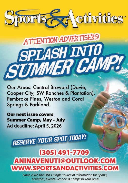 It’s a new season for sports, and registrations are happening now. You can find them all in the Main Directory in the red-tabbed section. Spring break is the week of March 16-20, beginning on Friday, March 13 for Broward County Public Schools. Be sure to page through our Main & Camp Directories to find some great options to keep your kids engaged.