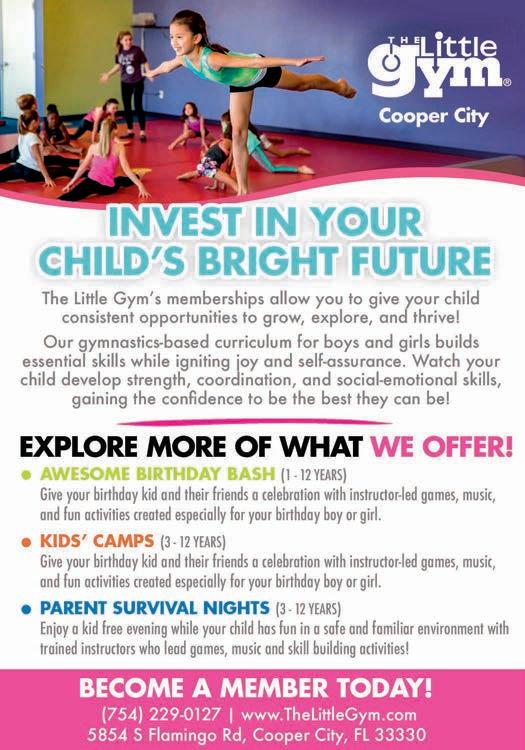 at each stage of childhood. From their first steps to confident flips, The Little Gym is here to empower children for life’s adventures. Our classes support your child’s physical, social, and emotional growth giving them the confidence to be the best that they can be! We offer Birthday Parties | Kids Camps | Parent Survival Nights | Events. Located at 5854 S. Flamingo Rd., Cooper City, 33330. (754) 229-0127. www.thelittlegym.com/florida-cooper-city.