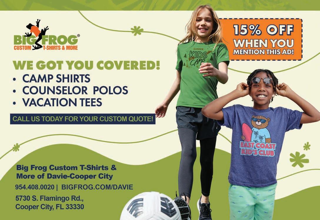 Big Frog Custom T- Shirts & More is your local spot for fast, friendly, and vibrant custom apparel and promotional items. Not sure what design you want? Enjoy 15 minutes of free design time with a graphic artist. And businesses, we have you covered with branded polos, backpacks, hats, and more. Try us on for size at 5730 S. Flamingo Rd., Cooper City or call (954) 408-0020.