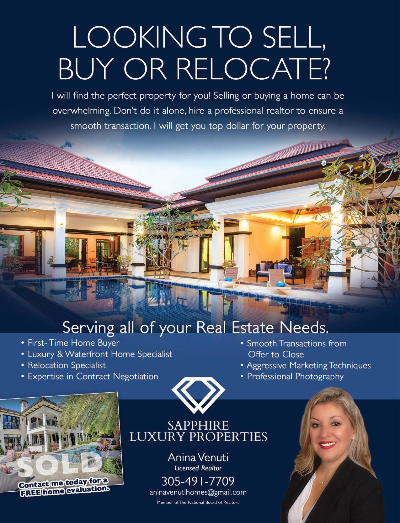 Sell or Buy your home with an expert who knows your neighborhood! It takes expertise to successfully navigate today’s real estate market. When working with a trusted real estate professional you gain the support of a partner who listens to your needs, understands your vision and personally guides you through the process. Relocating, expanding family, downsizing, we have something for everyone, because everyone’s needs are unique. Anina has you covered! Call Anina Venuti licensed realtor (305) 491-7709, Sapphire Luxury Properties.