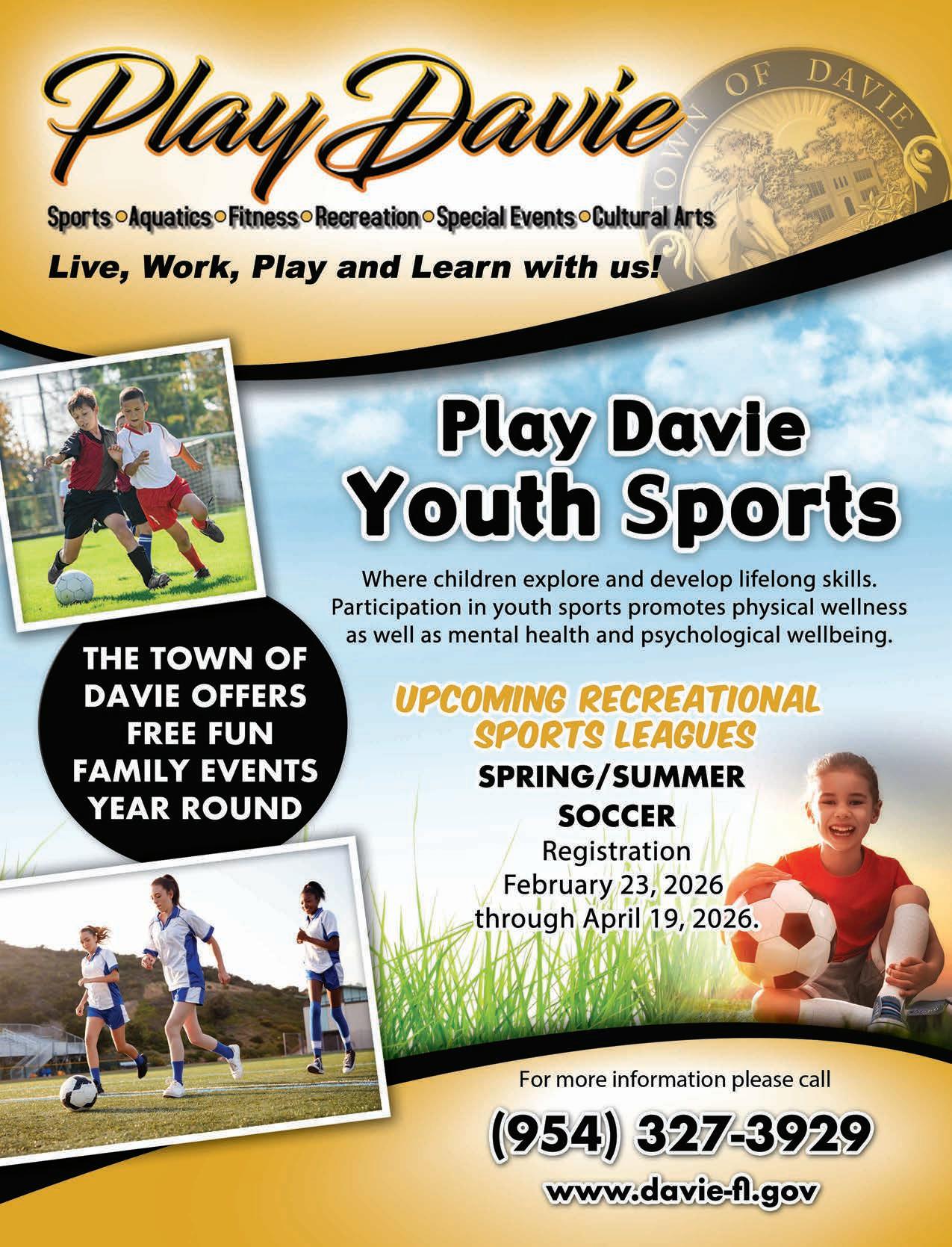 Participation in recreational programs and activities provides many health benefits to Davie’s youth, adults, and seniors. Whether it’s swim lessons, fitness, youth sports, senior activities, special events, or recreational classes that interest you and your family, the Town of Davie has something for everyone to enjoy. As you browse through the Sports and Activities Directory, keep a lookout, as all the programs provided by the Town of Davie Parks, Recreation, and Cultural Arts Department begin with “Davie”. For more information on any Town of Davie program, please call (954) 327-3941.
