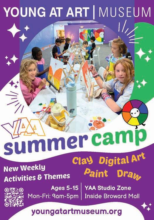Get ready for a colorful adventure at Young At Art Museum’s Summer Art Camp! Campers explore ceramics, drawing, painting, mixed media, and more. For artists who want to dive deeper, choose from our specialty camps in Drawing, Painting, Sculpture, or Digital Art. Each week features a new, exciting theme and is packed with museum gallery visits, visiting artists, movie days, costume fun, and creative surprises. Campers stay active, build skills, make new friends, and—most importantly—have a blast! At YAA, everyone is an artist. Located inside Broward Mall, 8000 W. Broward Blvd., Plantation | youngatartmuseum.org/camp | (954) 424-0085.