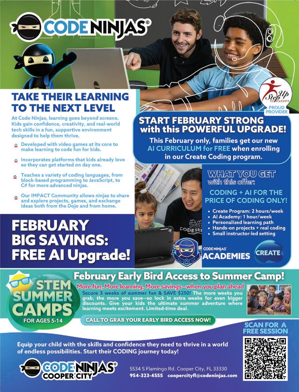 At Code Ninjas, summer is an unforgettable adventure full of excitement and fun learning. Kids ages 5–14 enjoy an action-packed experience where creativity, confidence, and real-world tech skills grow naturally in a fun, supportive environment. Our themed summer camps keep kids engaged all summer long with hands-on activities inspired by Minecraft®, Roblox®, YouTube content creation, 3D printing, Robotics, and Coding—all while making friends and having a blast. In addition to Summer Camps, we also offer AI and Robotics Coding programs, Birthday Parties, After-School Drop-Ins, and Parents’ Night Out—a win for both kids and parents. Enroll today and make this summer one to remember! Visit us at: 5534 S Flamingo Rd., Cooper City, 33330. (954) 323-4555.
