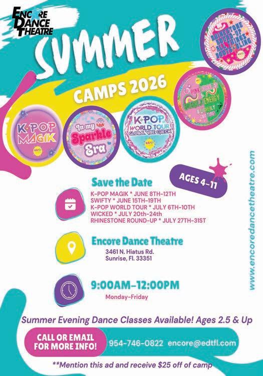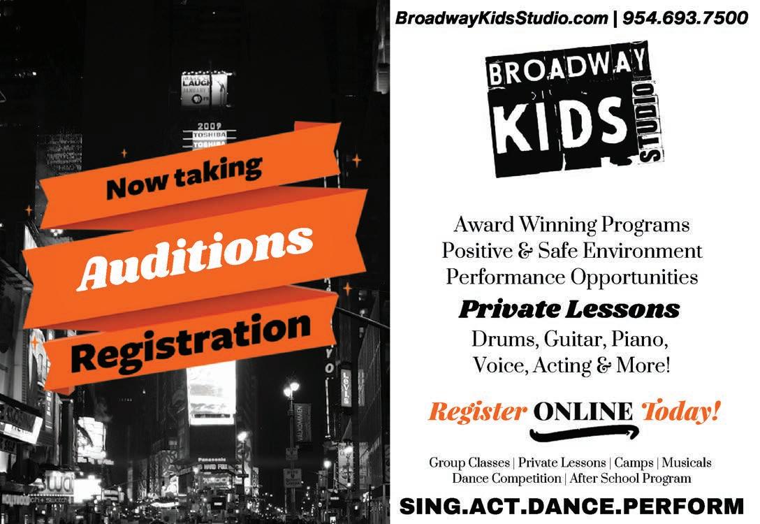9042 West State Road 84, Davie 33324 (Ridge Plaza behind The Round Up). Awarded Best Kids Theater Program, Summer Camp at Broadway Kids Studio is a one-of-a-kind experience. Our camps focus on learning, creativity, equal performance opportunities, and fun. Summer Camp is one of our most popular offerings and sells out every year—early registration is highly recommended. Camps are divided by age group to ensure an engaging experience for all students. Campers perform in full-scale musicals each session, with additional options including weekly summer dance camps and Broadway-style intensives. Register at www.BroadwayKidsStudio.com or call (954) 693-7500.