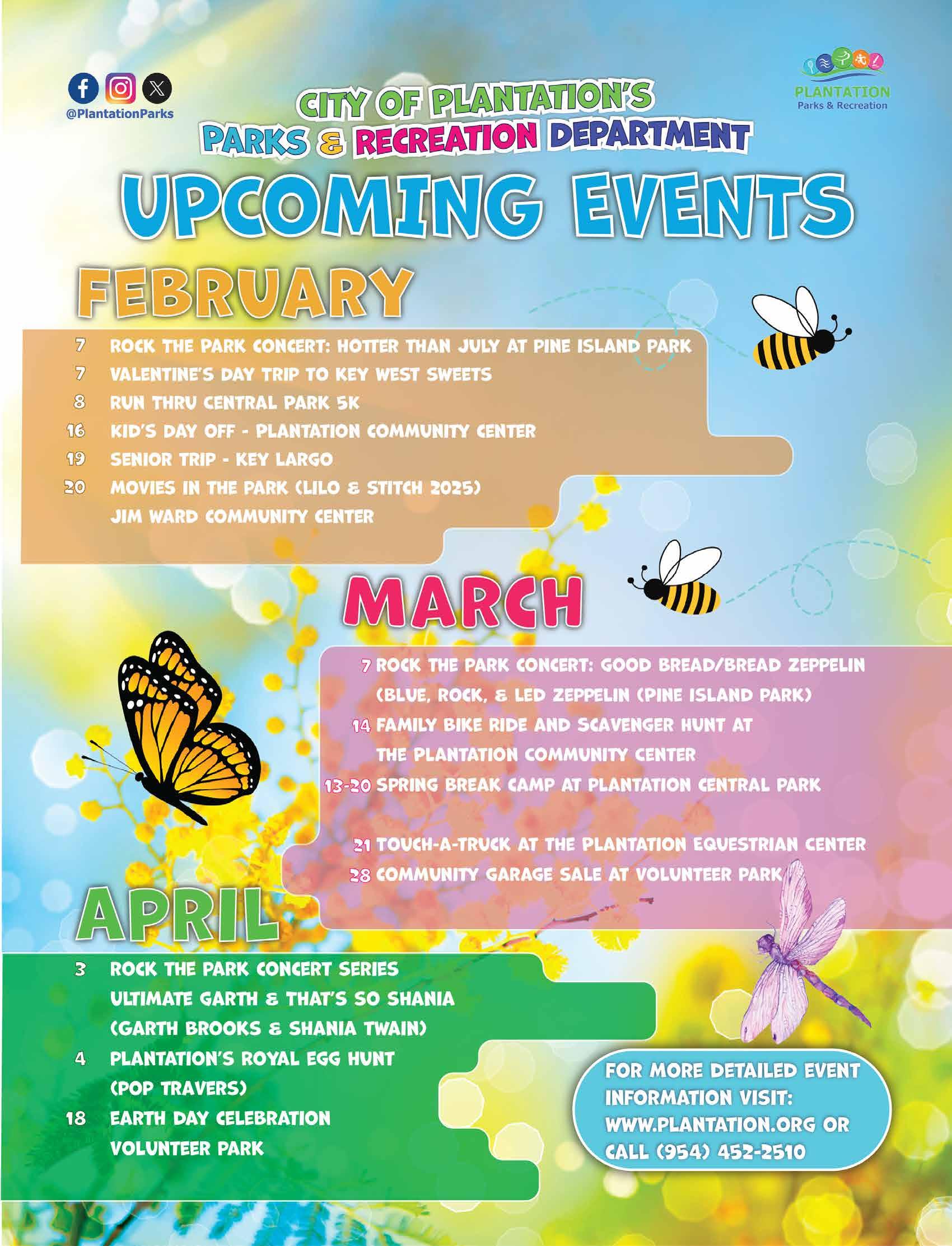 Spring has sprung in the City of Plantation! The flowers are blooming, the birds are singing, and I am writing this before the humidity decides to make its grand return. We have a jam-packed schedule over the next few months designed to get you outside, moving, and perhaps finding that vintage lamp you didn’t know you needed. We are kicking things off musically with our Rock the Park concert series. Mark your calendars for Saturday, Febuary. 7; Saturday, March 7 and Friday, April 3. If you haven't been yet, you are missing out on great fun. February is for the arts (and aliens). Our Art Search contest wraps up on February 13, so get those entries in! Then, grab a blanket and join us for Movies in the Park on Friday, February 20 for a showing of the new Lilo & Stitch. Popcorn is optional, but highly encouraged.