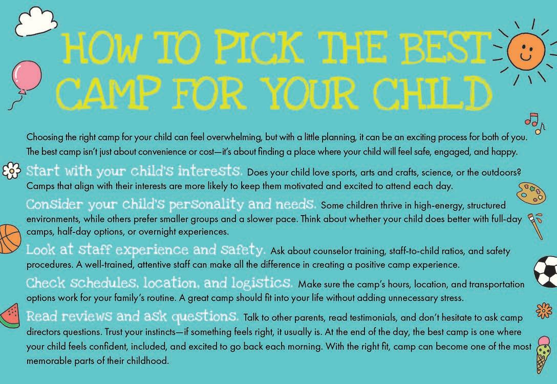 It may seem early, but February and March are the perfect times to explore and register for Summer Camp 2026. We have a special, purple-tabbed section featuring Summer Camp in this issue that’s full of fun, sports, enrichment & educational programs for children of all ages. From monthly camp sessions to weekly camps or even day camps, there are plenty of options to choose from. We’re confident you’ll find the perfect fit! Maybe your child would like learn horseback riding, basketball, soccer, volleyball, acting/theatre, art, robotics, languages, academics, or learn to play a musical instrument this summer. Whatever you choose, we have them all covered. I’m confident you’ll find the perfect fit.