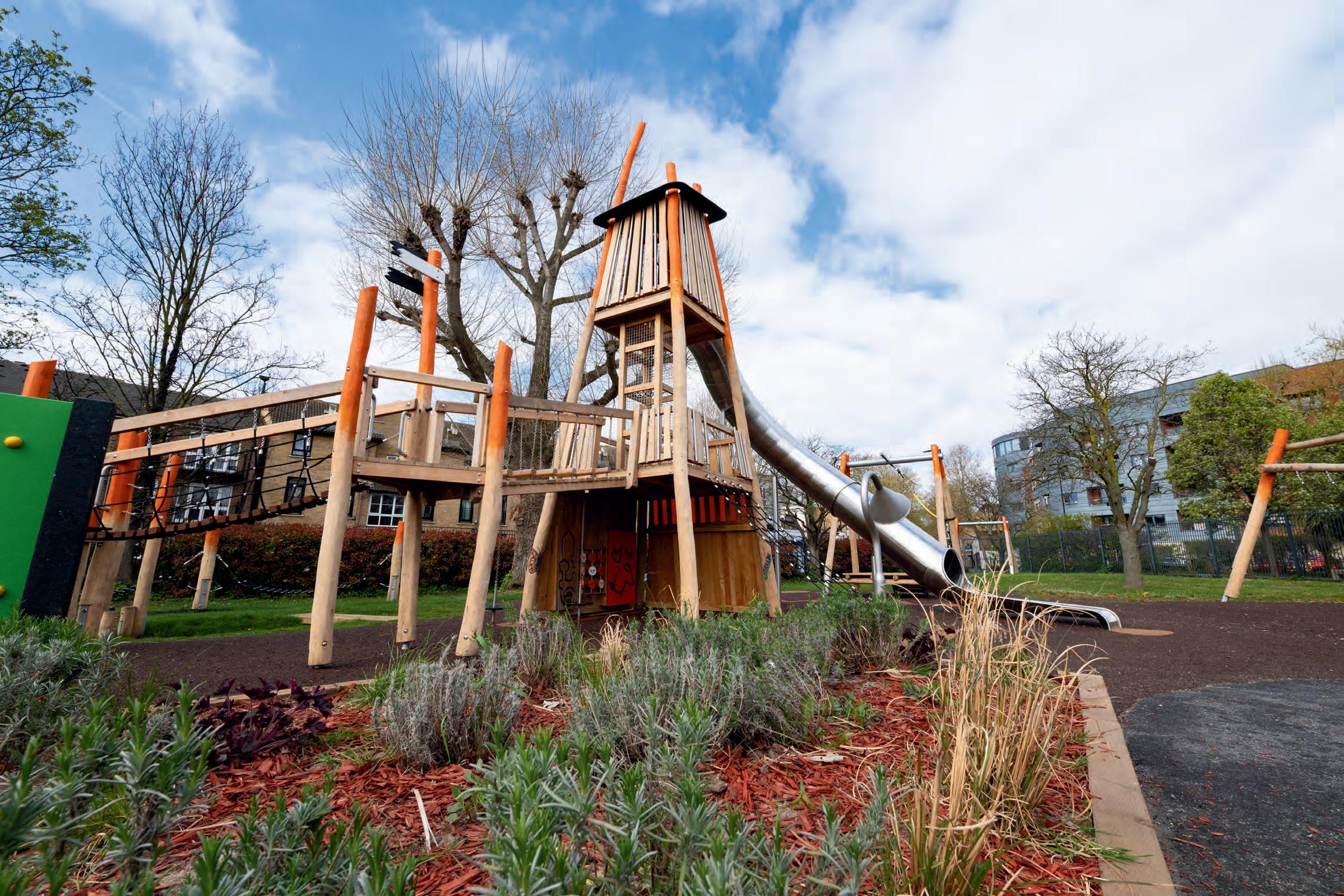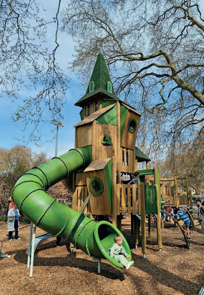 The design vision focused on ageappropriate challenge that builds confidence, inclusive design that welcomes children of all abilities, offering sensory-rich elements that stimulate curiosity and having clear sightlines and accessibility for parents and carers. The design has been directly shaped by young people themselves. Primary-aged children from Coram’s Fields’ Kids