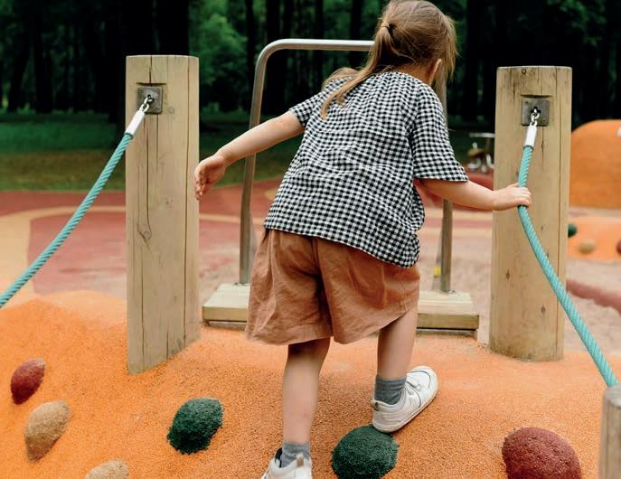 responded to the community’s aspirations, as Dylan initially envisioned. They aimed to create a year-round accessible space promoting both physical and social skills for children aged 2-14, ensuring inclusion for every visitor, regardless of ability. A wetpour surface was selected to guarantee durability and accessibility, which is essential for a venue welcoming both wheelchairs and strollers. The play equipment was chosen from Eibe Play’s diverse collections and includes sensory play options enhancing the tactile experience of the area.