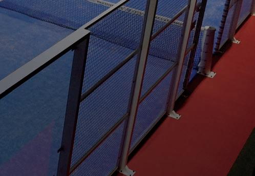 The surrounding enclosure and rebound walls to a padel court should be formed of a combination of a transparent or solid material (glass, rendered blockwork) which does not affect ball rebound. The transition between the glass (solid) internal surface and the metal panels should finish flush and neither surface should protrude further than the other to prevent irregular ball rebound response and minimise risk of injury to players.