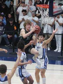 CLOCKWISE FROM LEFT: Whitney-Rocklin wrestler Anthony Berg leaps into the arms of his coach after winning a Sac-Joaquin Section Masters title; Mitty-San Jose junior Morgan Cheli glides to the hoop during the CIF Open Div. state final; Granite Bay’s Yaqub Mir drives to the basket during the SJS Div. II championship against Whitney; De La Salle sophomore Alec Blair splits two Dougherty Valley-San Ramon defenders during the North Coast Section Open Div. final; But it was Ryan Beasley and Dougherty Valley who cut down the net.