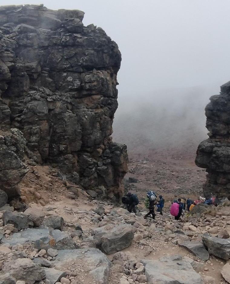La tercera noche bajo las estrellas fue todo un bálsamo medicinal. El día comenzó por un sendero que se fue transformando en semidesértico. Desafortunadamente, la niebla de las primeras horas no me dejó disfrutar en su totalidad del paisaje de la primera parte del camino que me acercaba sigilosamente hasta una imponente formación magmática de unos 4.500 m que se conoce como Lava Tower y que se encuentra en el Lava Tower Camp, situado a los pies del Glaciar Arrow. Un pequeño almuerzo para consolidar la aclimatación dio el tiempo necesario para que la niebla se fuera desvaneciendo y, en el descenso hasta Barranco Camp (3.950 m), pude recuperar el tiempo perdido y deleitarme de las impresionantes vistas de la Breach Wall y de la Barranco Wall.
