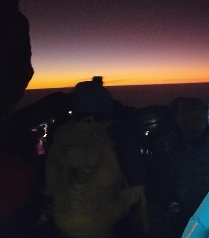 Casi a punto de que la primera luz del día me saludase, llegué al Stella Point a 5.735 m, ubicado en el borde del cráter cimero. Parada obligatoria y necesaria para reponer fuerzas y seguir los últimos 150 metros que separan de la preciada cima. Un dato curioso es que ese punto recibe el nombre en honor a Estella Kingsley Latham, que se convirtió en la primera mujer registrada en alcanzar ese punto.
