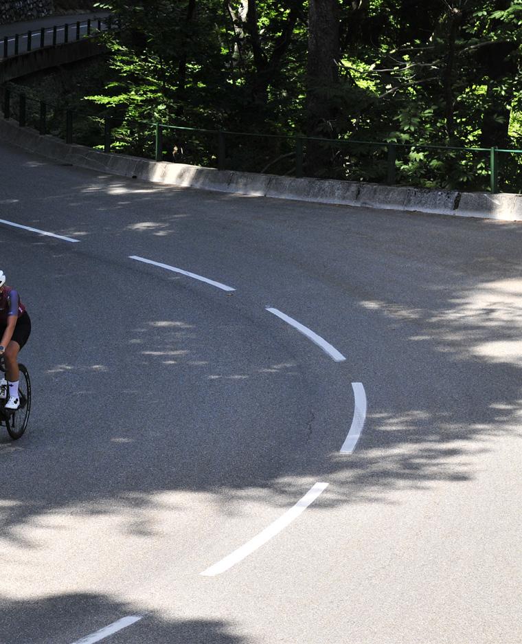 Al pasar por la alfombra del chip, cada una de nosotras coge su ritmo. Es un puerto muy agradable de hacer porque su subida nunca llega a ser empinada. El pedaleo se realiza entre bosques y a veces divisas las hermosas montañas de su alrededor. No encontramos nada