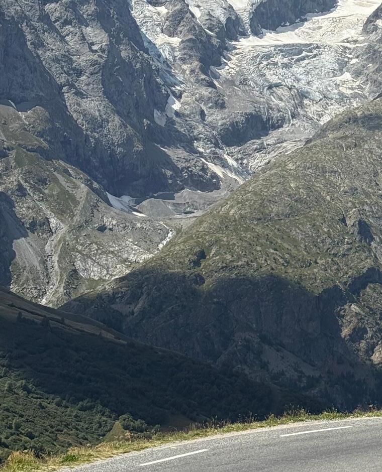 con algunos tramos de carril bici a lo largo del valle de Serre Chevalier. En los últimos 10 kilómetros, pasamos por varios túneles en obras, pero a la izquierda se abría un espectáculo: los picos nevados y los glaciares del Parque Nacional de Écrins. Alcanzada la cima, foto de grupo y bidones llenos antes de encarar la segunda parte: el Col de Galibier.
