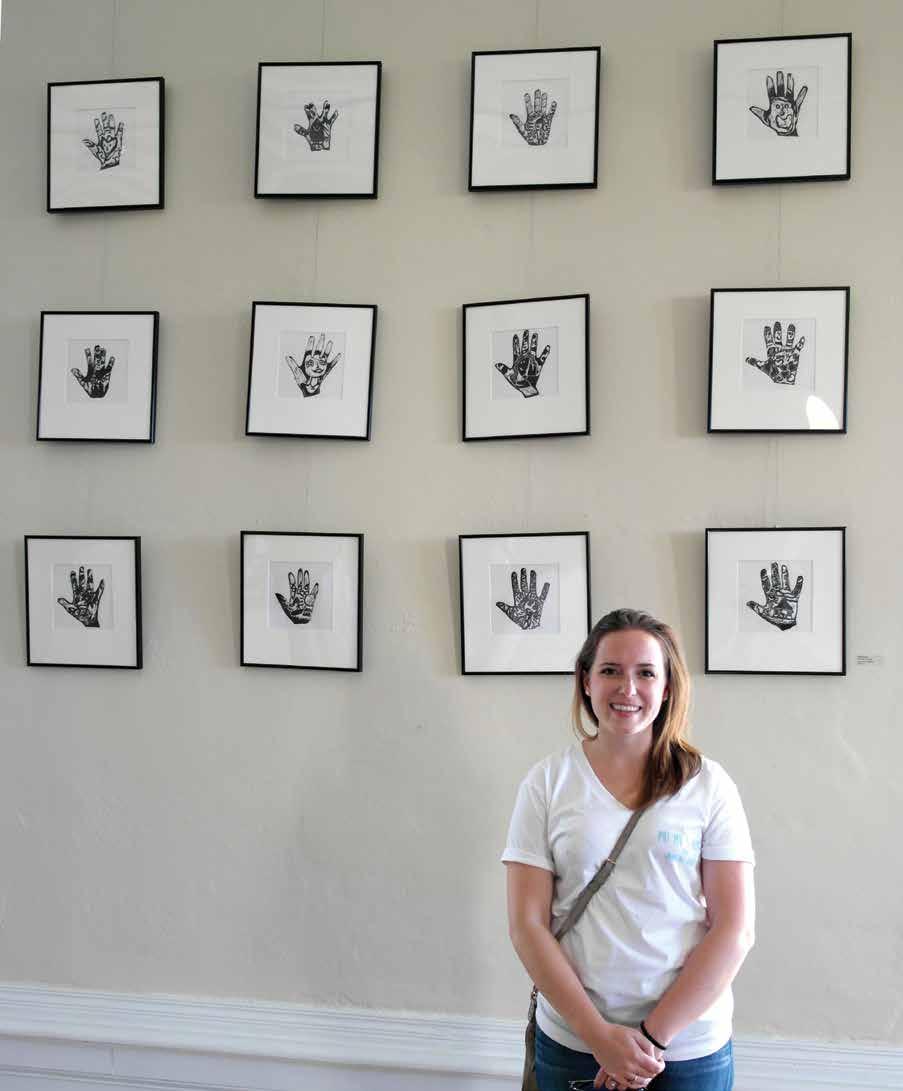 a double major In studIo art and psychology, Cochran used her background in both fields to do therapeutic art activities with the children in individual and group settings. The activities sparked the idea to do a collaborative piece for her senior art show that would take place the following spring semester. she took the children’s drawings and their handprints and transferred them to linoleum to create linocuts. she said, “i wanted to have the uniqueness of the child’s own hand with their own drawing.”