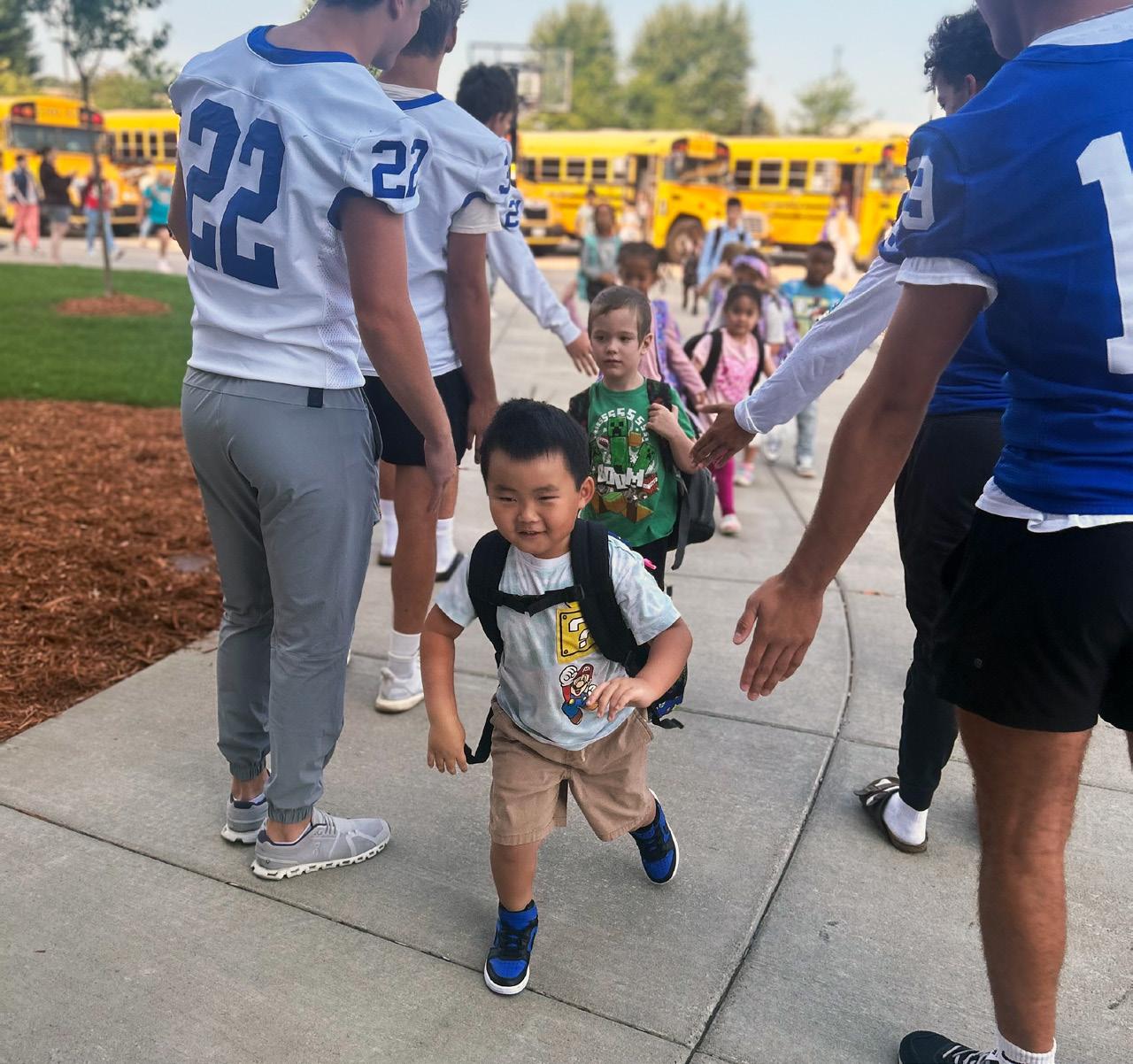Spring Lake Park High School football players spread out across the district to welcome some of our youngest learners to their first day of school.
