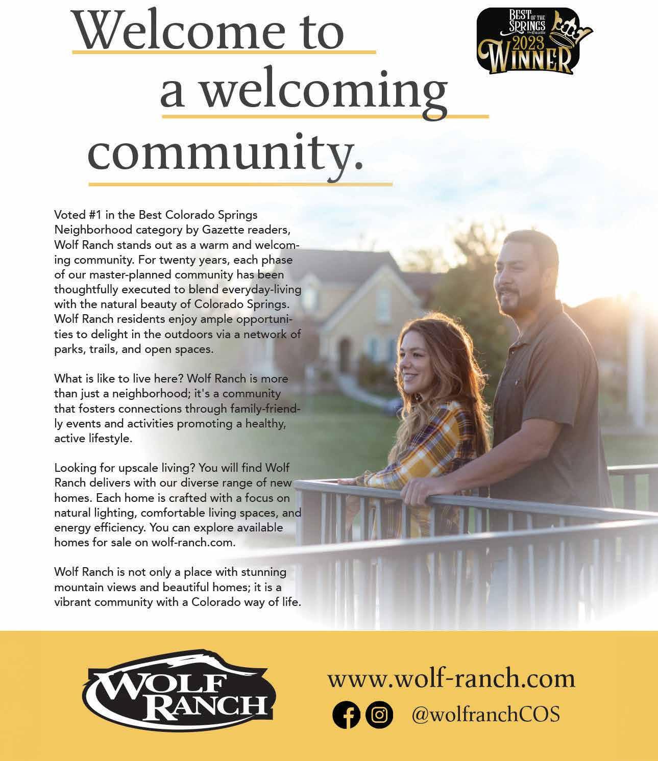 Voted by Gazette readers as one of the best neighborhoods in Colorado Springs, Wolf Ranch is a vibrant new housing community that places value on a Colorado quality of life. The community has been intentionally developed into a neighborhood that weaves everyday life with Rocky Mountain sunshine.