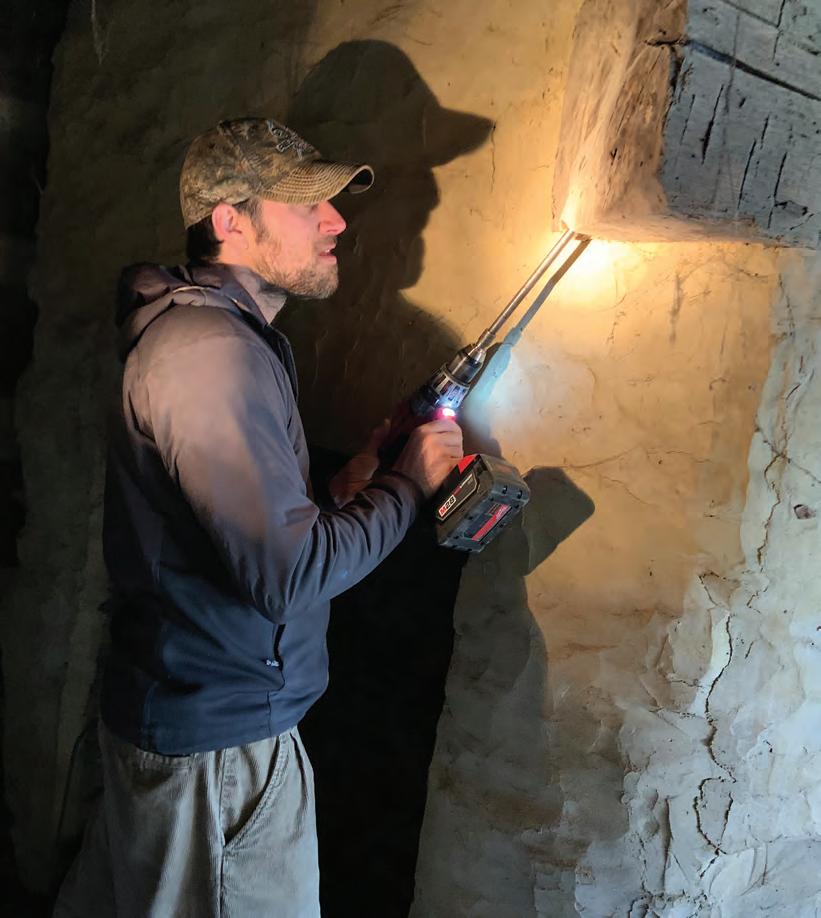 Once the house was shorn up and all the replacement logs were in place, the next step was to prepare the NLH for new chinking. Chinking is the material that fills in the gaps between the logs; if there’s no chinking, then the sun’s rays, as seen here, and all sorts of elements will penetrate the house. In addition to weatherizing the interior of the house, chinking adds stability to the walls. The eighteenth-century chinking would have been all natural, primarily clay applied to small stones. Although the modern chinking is synthetic to enhance its effectiveness and the durability of the restoration, it is finished to a color that mimics the historic appearance of the log house.