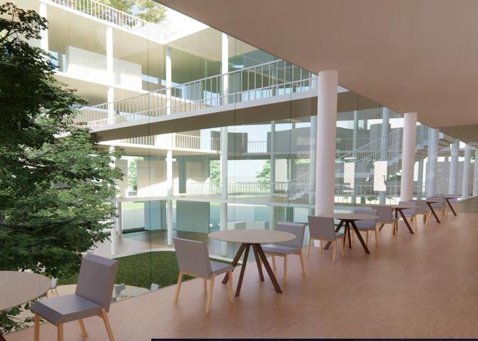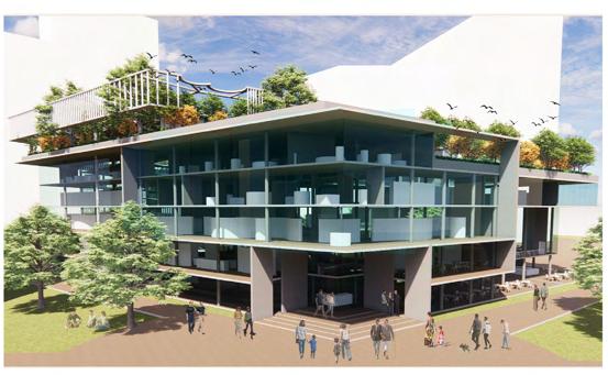 Hero view of “Infinito” Learning Centre: This view showcases the existing north walkway, which connects the public areas of the building to the riverside walkway and the surrounding residential areas, providing accessibility and leading to the main entry of the building.