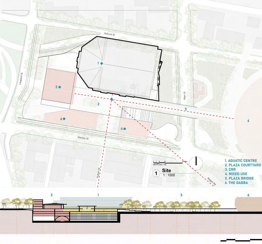 “Piscina” is the Olympic Aquatic Centre in Woolloongabba. The project that is progressing alongside the strategic master plan for Woolloongabba, which aims to increase the area’s density and connectivity through upgrades to public transportation options, including the CRR, metro, and bus services. This initiative will support the Brisbane 2032 Olympic Games and also enhances community facilities, ensures accessibility for everyone. Additionally, the plan seeks to expand public and green spaces, enhancing connectivity to prioritize walking and cycling, thereby facilitating easy access to various amenities. This will improve the quality of life and promote health and well-being within the community.