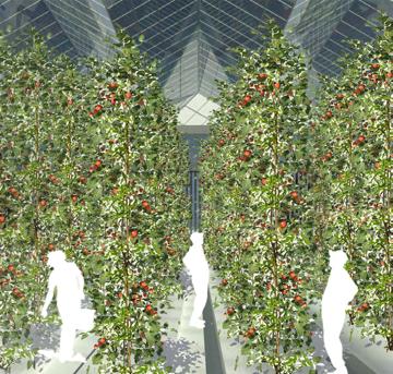 The crop cultivation area, designated for growing tomatoes, utilizes hydroponic technologies to maximize the efficiency of the space through vertical farming. The use of a gable roof in the production area allows natural sunlight to penetrate through the glass, supporting optimal conditions for crop growth.