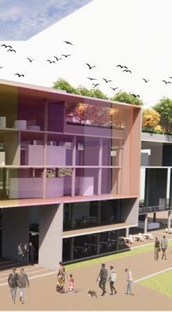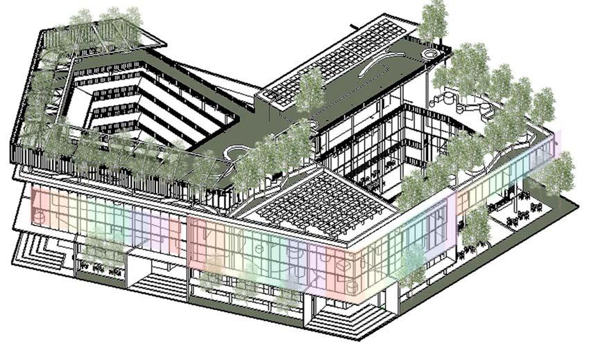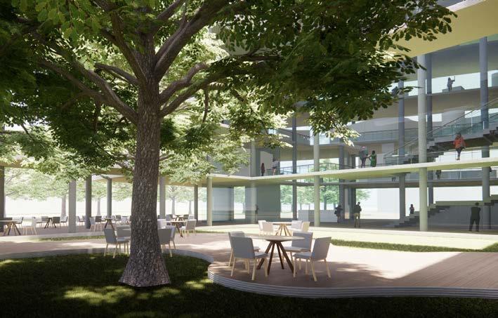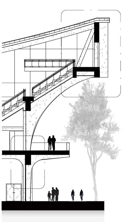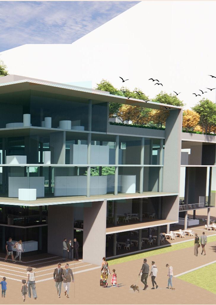 Hero view of “Infinito” Learning Centre: This view showcases the existing north walkway, which connects the public areas of the building to the riverside walkway and the surrounding residential areas, providing accessibility and leading to the main entry of the building.