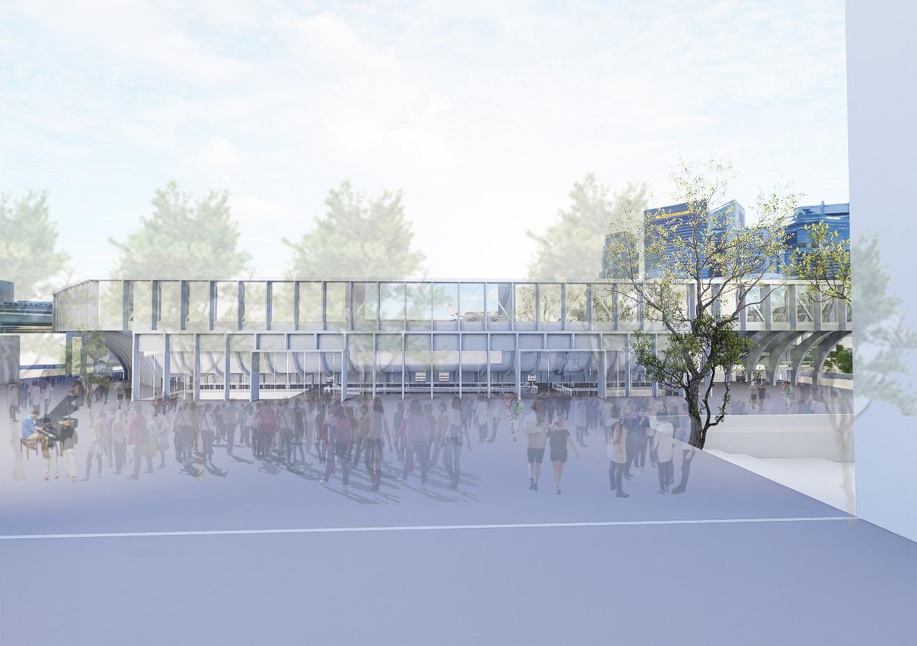 View from the plaza bridge linking to plaza courtyard connected to the aquatic centre, green space, mixed use area and CRR.
