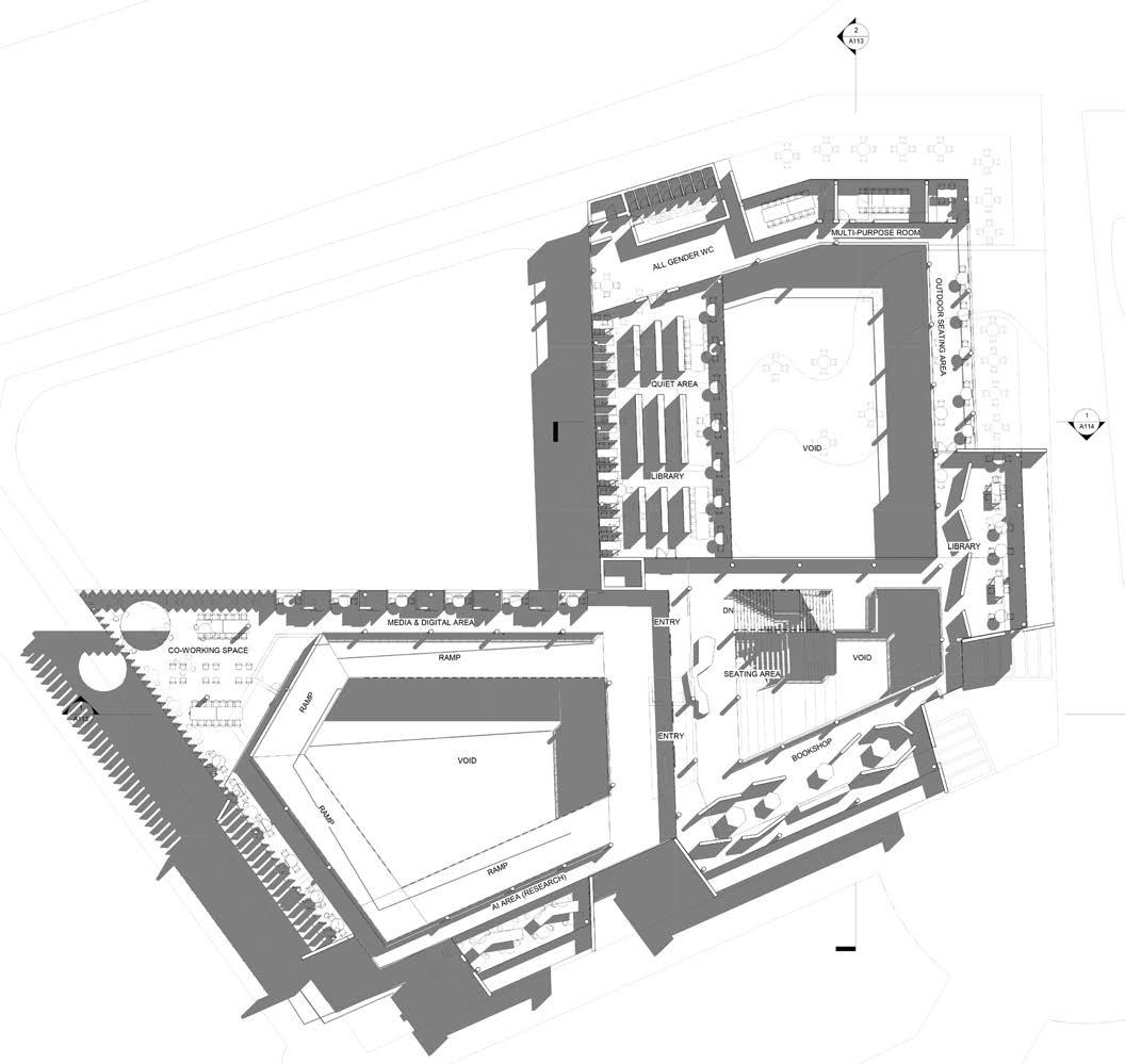 The double-height spaces on the first floor are designed for multiple purposes. The view highlights the connection between the main public archive space and areas for various activities, offering room for meetings and community interactions. The planted facade links the interior to nature, contributing to the well-being of those who use the space.