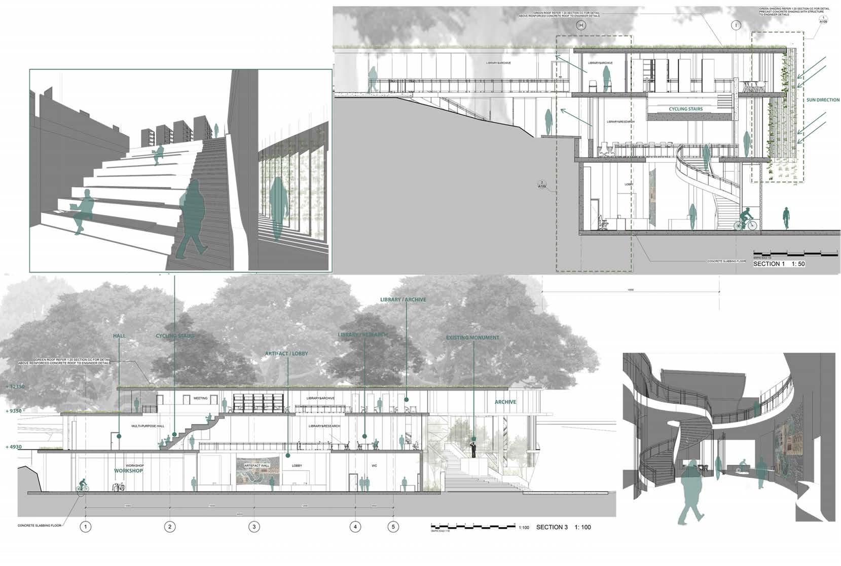 The view highlights the curves and lines of the interior design, directing visitors to the artifact display, workshop, café, and bikeways. This layout fosters spaces for community gatherings and strengthens connections within the community, its environment, and nature.