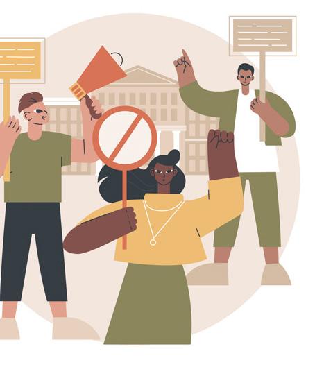Image: abstract image in neutral tones of activists holding plackards in front of a formal looking building.
