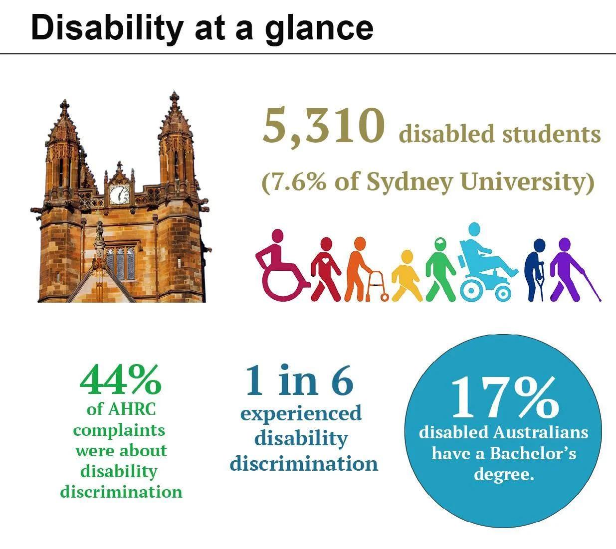 Data obtained from the University of Sydney Annual Report 2023, Australian Institute of Health and Welfare’s People with Disability Australia (2022).