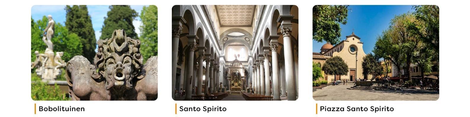VanafhetgrootsePalazzoPittiwandeltuzodewijkSantoSpiritoin,eenvandevolksere wijkenvanFlorence.De basiliek van Santo Spirito isongetwijfeldeenvandemooiste renaissancekerkenvandestad.NiemandminderdandeberoemdearchitectFilippo Brunelleschitekendevoorhetontwerp.Zoweldegevelalshetplechtstatigeinterieurin pietraserenazijnprachtig!