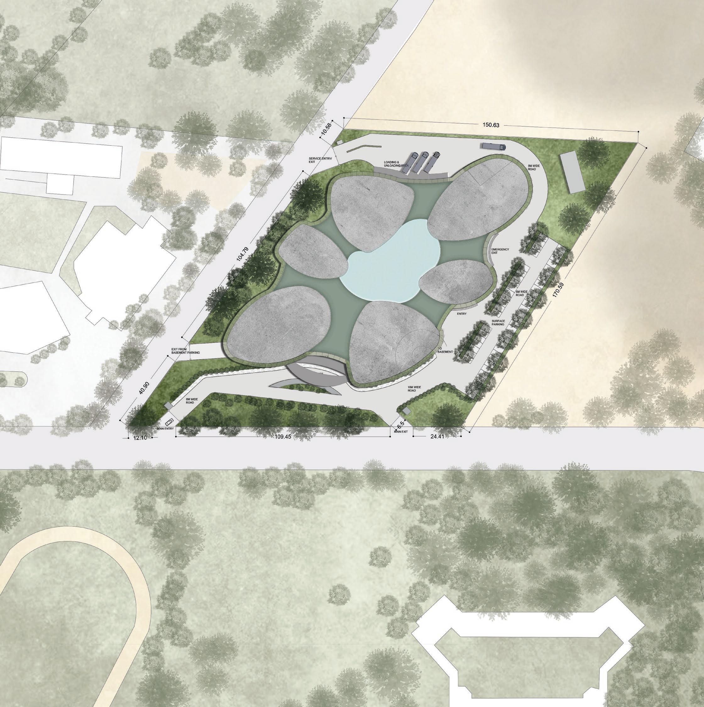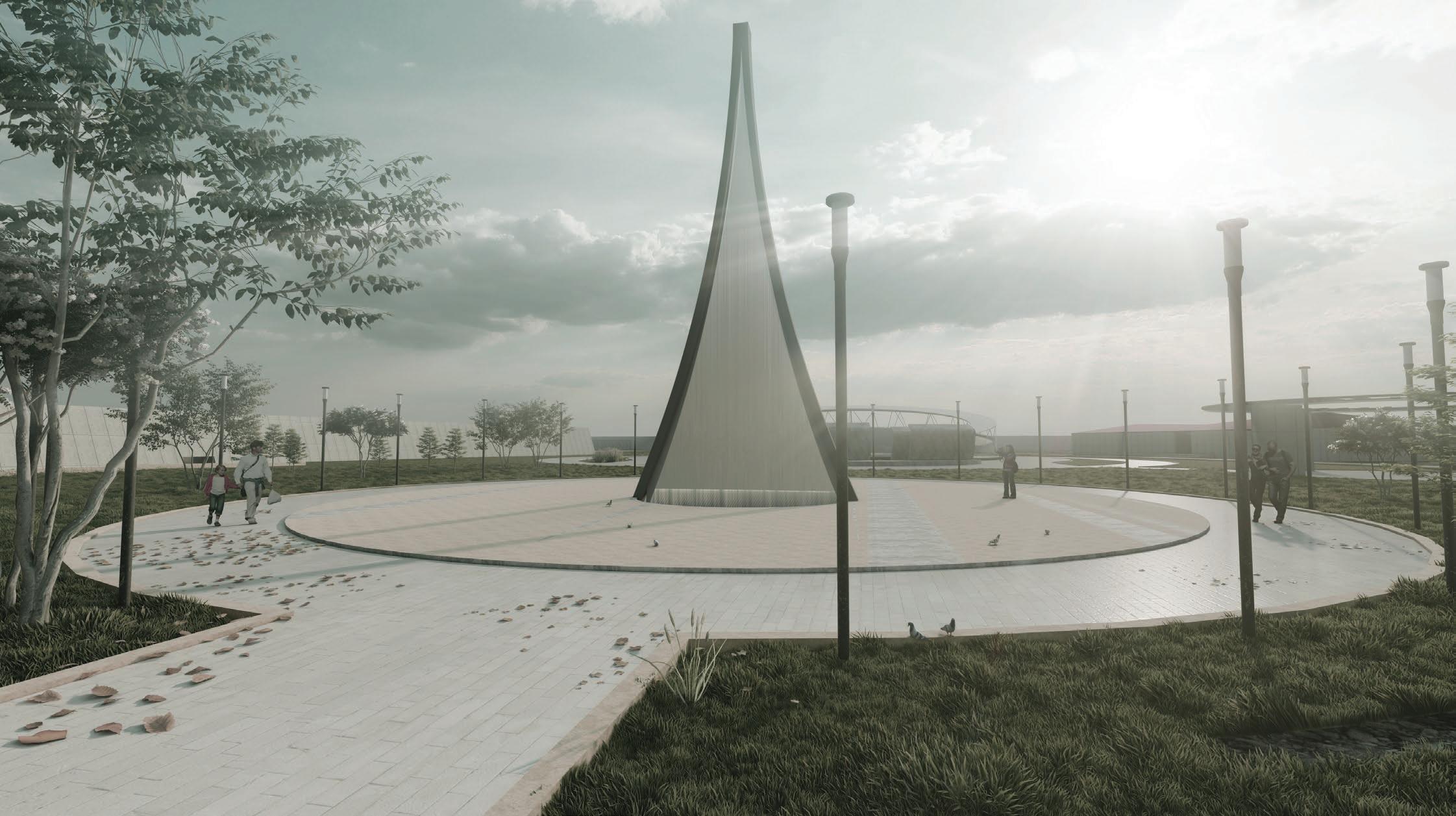 Wall of names is followed by the tribute stamba which reflects the void that the freedom fighters left in the people by their absence. The tribute tower is made of two slanting columns looks like it merely supporting each other and the void is filled with the water curtain. the water bodies on the site is surrounded by rain gardens to cpnserve water and to process the runoff water in case of storm water.