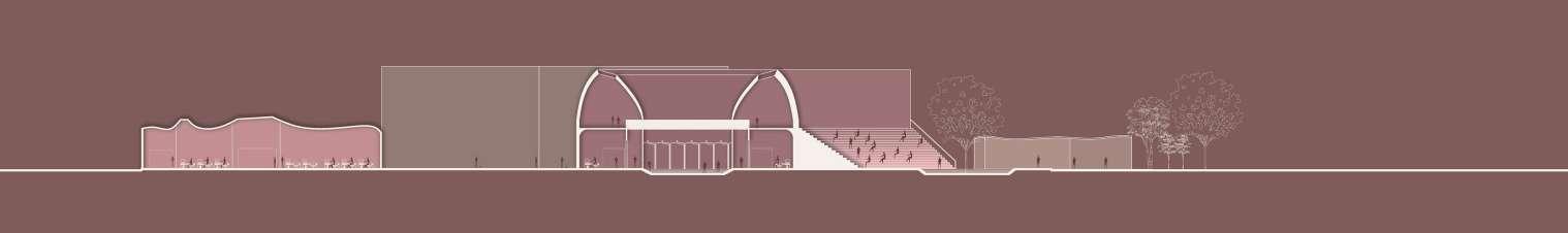 The built consists of berms adapting to the natural topography acting as performance spaces and seating spaces, library pockets/ niches of learning through the colonnade. The fort wall is replaced by seating spaces and mela spaces in the back and a bus stop in the front. A staircase beside the colonnade leads to the cultural training centre and anganwadis in the first level.