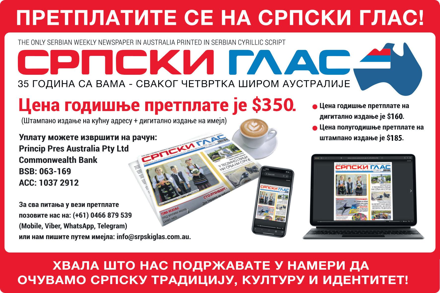 Cena godi{we pretplate na {tampano izdawe je $350. Polugodi{wa pretplata iznosi $185. Uplatu mo`ete izvr{iti na ra~un: Commonwealth Bank Princip Pres Australia Pty Ltd; BSB: 063-169; ACC: 1037 2912
