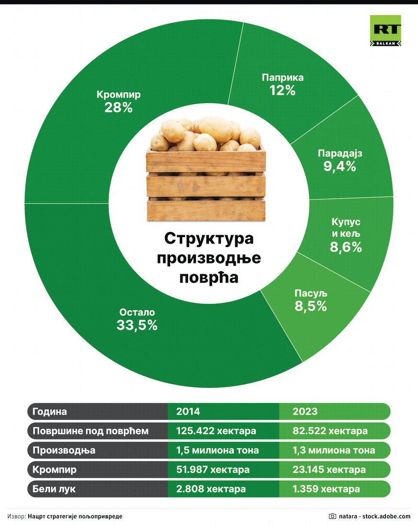 Srbija bele`i stalni pad interesovawa proizvo|a~a za gajewem krompira, pa je 2023. godine on zasa|en na svega 23.145 hektara, dok je 2014. ovo povr}e bilo zasa|eno na 51.987 hektara. U proteklih desetak godina prepolovqena je i proizvodwa belog luka – sa 2.808 pala je na 1.359 hektara. Proizvo|a~i ka`u da visoki tro{kovi proizvodwe i energije za wegovo skladi{tewe presudno uti~u na smaweno interesovawe ~ak i evropskih farmera da odr`avaju raniji obim proizvodwe krompira.